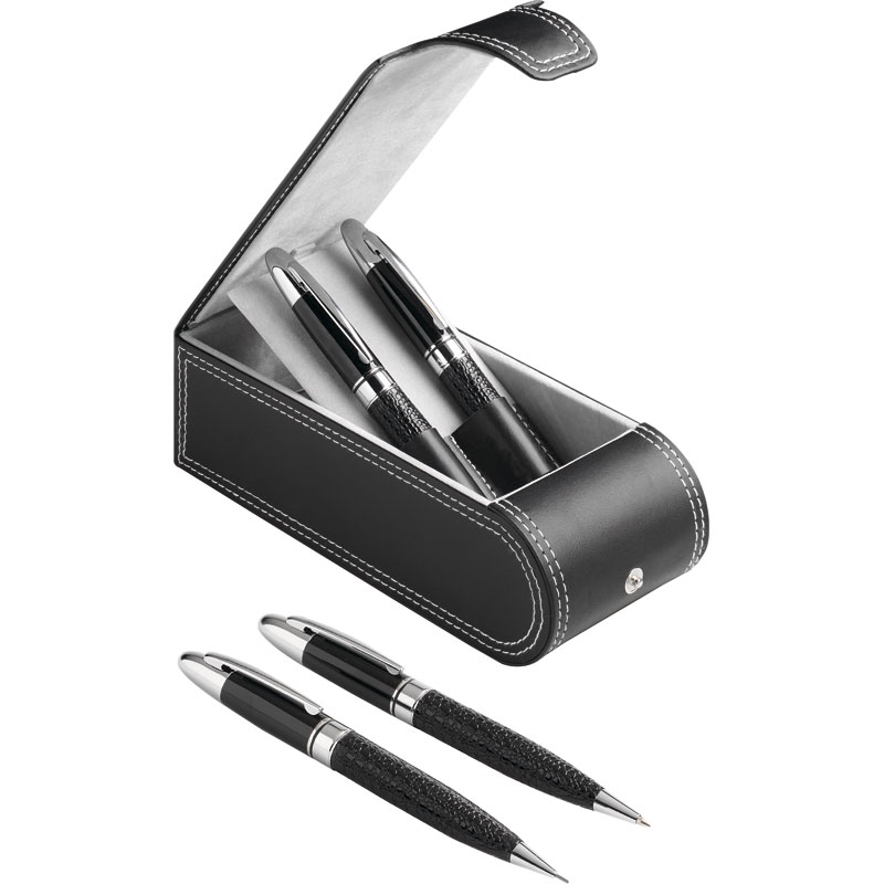 Set format din pix si creion automat in penar din piele. Dimensiuni 18 x 7.5 x 5.58 cm. Logo 27 x 7 mm.