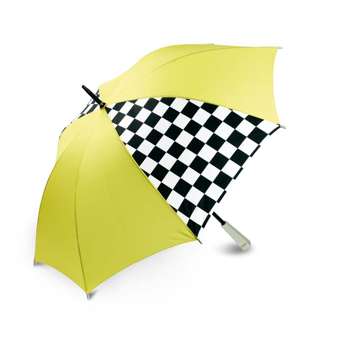 Umbrela mare cu deschidere manuala, cu 8 segmente, 2 segmente in table de sah alb neagra si 6 segmente colorate. Culori: albastru, rosu, glaben si argintiu. Dimensiuni 83xø99 cm. Logo 180X100 mm.