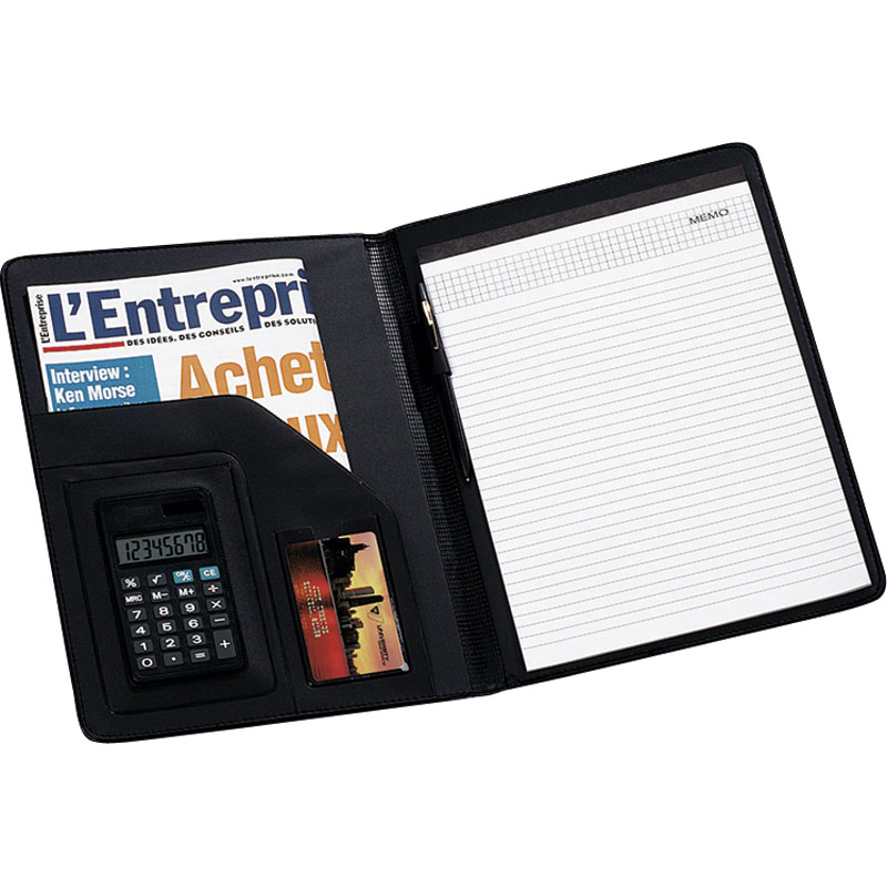 Mapa pentru conferinta A4. Material: PU. Dimensiuni: 32x24x 2cm. Logo 70x40 mm. Include: pix, pad si calculator cu alimentare duala: solara si baterie inclusa.
